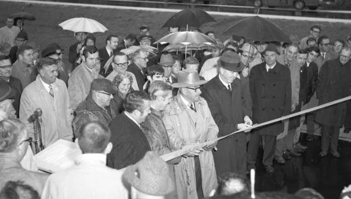 Broadcaster Frank Balch, Federal Highway Administrator Rex Whitton, Governor Deane Davis, and Gerald Love attended a rainy ribbon-cutting ceremony that marked the grand opening of Interstate 89 during the fall of 1970. (Vermont State Archives / Woody Grimes)